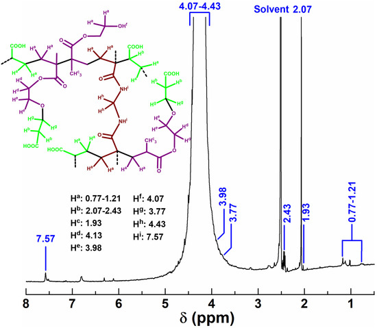 In TP, the formation of –H2C(β)–CH2(α)–CO– and –H2C(β)–CH(CO)– moieties from H2C=CH–CO– via C–C coupled polymerization was inferred from (–CH2(α)–/>CH–) and –CH2(β)– peaks within 2.07–2.43 and 0.77–1.21 ppm (Figure 1), respectively, as well as the obsolescence of vinyl-proton-specific peaks within 6.03–6.59, 5.53–6.15, and 5.59–6.13 ppm for AA, HEMA, and MBA, respectively [10,33]. Again, in TP, peaks at 4.13/3.98 and 1.93 ppm attributed to –CH2– and –CH3 of HEMA confirmed the inclusion of HEMA in TP. Similarly, the presence of MBA in TP was inferred from the characteristic –CH2– peak of MBA at 4.43 ppm. Importantly, the O–C coupled in situ attachment of the third comonomer, i.e., (3-(2-((2-methylbutanoyl)oxy)ethoxy)propanoic acid)/MBOEPA, could be inferred from –CH2CH(CH3)COOCH2CH2OCH2CH2COOH peak at 3.77 ppm in TP [19,20]. Moreover, the characteristic N–H and O–H peaks of MBA and HEMA occurred at 7.57 and 4.07 ppm in TP, respectively.