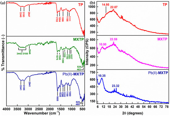 (a) FTIR and (b) XRD of TP/ MXTP/ Pb(II)-MXTP.