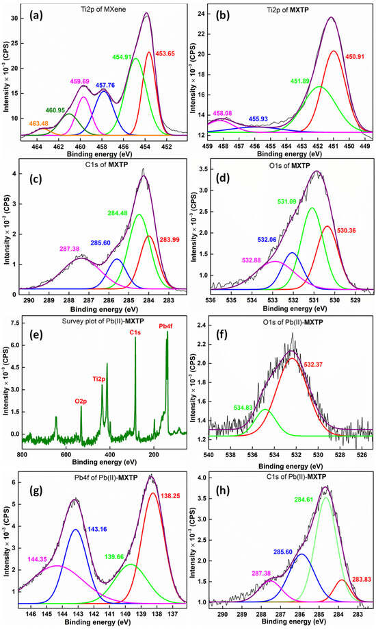 XPS of (a/b) Ti2p of MXene/MXTP, (c/h) C1s of MXTP/Pb(II)-MXTP, (d/f) O1s of MXTP/Pb(II)-MXTP, and (g) Pb4f of Pb(II)-MXTP and (e) survey plot.