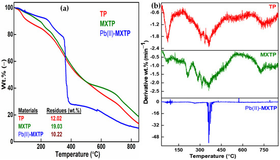 After adsorption of Pb(II) at pH > pHPZC, the significant reduction in hydrogen bonding as reported from FTIR analysis would be expected to intensify the removal rate of vapor, resulting in the more rapid thermal degradation of Pb(II)-MXTP compared to MXTP. This expected behavior could be confirmed by the degradation rate of 4.69 wt.% min−1 of Pb(II)-MXTP compared to 2.13 wt.% min−1 of MXTP (Figure 4b). However, almost similar thermal stability was observed for Pb(II)-MXTP and MXTP up to 111 °C. Importantly, the improved thermostability of Pb(II)-MXTP compared to that of MXTP within 111–349 °C can be related to the formation of a Pb(II)-acetate type complex in Pb(II)-MXTP, which restricts acid to anhydride formation and its decomposition [1,2]. Formation of coordinate bonding within Pb(II) and –COO− during adsorption has already been established from shifting of O1s of –COO−, Pb4f7/2, and Pb4f5/2 Bes from 531.09, 143.80, and 139.30 eV of MXTP to 532.37, 143.28, and 138.49 eV in Pb(II)- MXTP (Figure 3) in XPS as well as from shifting of >C=O asym. Str. Of –COO− from 1540 cm−1 of MXTP to 1535 cm−1 in Pb(II)-MXTP in FTIR. Moreover, the Pb(II)-acetate type complex contained crystal water, which could not be eliminated within 120 °C [51]. Therefore, the expected initial poor thermostability originating from the lack of hydrogen bonding was made up by the retention of crystal water within the Pb(II)-acetate type complex in Pb(II)-MXTP. For MXTP, three distinct DTG peaks at 212, 286, and 314 °C were observed as having rates of mass loss of 1.74, 1.92, and 2.32 wt.% min−1, respectively, within 111–349 °C (Figure 4b). However, the mere DTG peak at 262 °C with the rate of mass loss of 2.04 wt.% min−1 in Pb(II)-MXTP justified the elevated thermostability of Pb(II)-MXTP compared to that of MXTP within this temperature range. Nevertheless, the sharp weight loss (47.02 wt.%) within 350–388 °C and the corresponding sharp DTG peak at 361 °C (rate of mass loss = 56.14 wt.% min−1) in Pb(II)-MXTP indicated the degradation of Pb(II)-acetate [52]. In fact, the steady decomposition of Pb(II)-MXTP up to 800 °C was attributed to the multistage decomposition of Pb(II)-acetate to generate PbO [51].