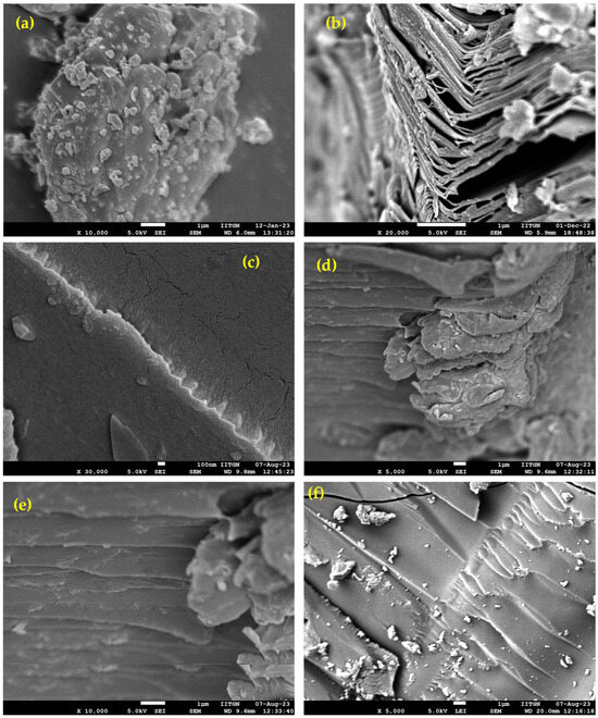 The etching of MAX (Figure 5a) by CaF2 + HCl resulted in the formation of tightly bound parallel planes, which are clearly visible in the FESEM photomicrograph of MXene (Figure 5b). Distinct alternative planes of Ti(IV) and carbides were generated via etching with in situ generated HF. In TP, featureless dense morphology without the distinct phase boundary could be visualized (Figure 5c), because of the C–C/O–C coupled covalent attachment of monomers. However, in MXTP (Figure 5d), the characteristic comb-like structure was visualized, suggesting the internalization of MXene with TP. The protruded plane-like appearance of MXene could be observed in the zoomed morphology of MXTP (Figure 5e). The superficial deposition of irregularly shaped Pb(II)-acetate complexes could be visualized in the photomicrograph Pb(II)-MXTP (Figure 5f). The existence of such irregular/non-crystalline shapes of Pb(II)-acetate complexes might be the reason for the absence of sharp peaks in the XRD of Pb(II)-MXTP.