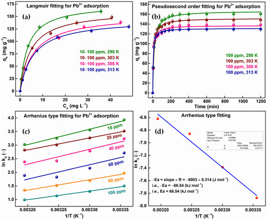 Statistical analyses of adsorption of Pb(II) onto MXTP: (a) isotherm (Langmuir model), (b) kinetics (pseudo-second model), and Arrhenius type fitting for evaluating (c) thermodynamic parameters and (d) activation energy (Ea).