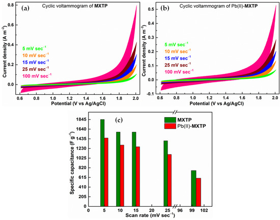 CV experiments of MXTP and Pb(II)-MXTP were carried out to study the effect of adsorbed Pb(II) on the specific capacitance of MXTP. From cyclic voltammograms of both MXTP and Pb(II)-MXTP (Figure 7a,b), current densities were found to increase with the increase in scanning rates from 5 to 100 mV sec−1. However, since Cp is inversely proportional to scanning rates (Text S1), Cp values were found to decrease significantly with the increasing scanning rates from 5 to 100 mV sec−1. The Cp values of MXTP were found to be 1844.65, 1579.02, 1577.87, 1392.79, and 760.88 F g−1 at 5, 10, 15, 25, 100 mV sec−1, respectively, which are significantly higher than the other MXene-based polymers. Therefore, the as-synthesized MXene-grafted polymer system can be successfully employed as a supercapacitor. After Pb(II) adsorption, Cp values were found to decrease, suggesting the increase in ion conductivity due to charge transfer (i.e., coordinative attachment)-type bonding of Pb(II) with MXTP. The variation in Cp values of MXTP and Pb(II)-MXTP with the increasing scan rate is depicted in Figure 7c.