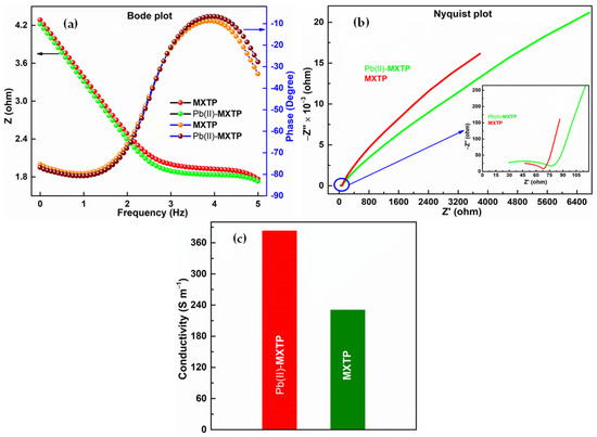 (a) Bode plot of MXTP/Pb(II)-MXTP, (b) Nyquist plot of MXTP/Pb(II)-MXTP, and (c) conductivities of MXTP/Pb(II)-MXTP.