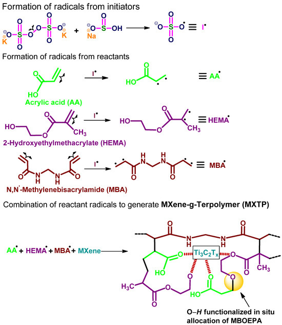 The maximum adsorption capacity in relation to the structural integrity of hydrogel was ensured by optimizing the equilibrium swelling ratio (ESR, g/g) of a series of poly[AA-co-HEMA] hydrogels obtained by varying synthesis parameters. The parameters varied include AA/HEMA (–/A) within 5–20; amounts of MBA (wt.%/B), K2S2O8 + NaHSO3 (wt.%/C), and total monomers (wt.%/D) in the range of 1.0–2.0, 1.0–2.0, and 10–30 wt.%, respectively; and temperature (K/E) within the range of 288–308 K. Notably, despite having faster gelation beyond 308 K, such hydrogels have not been considered here to minimize the environmental impact of the use of synthetic constituents. The optimized conditions of synthesis were found to be 10, 1.5 wt.%, 1.5 wt.%, 20 wt.%, and 298 K for A, B, C, D, and E, respectively (Table S1). For the synthesis of TP (Scheme 1), 27.15 mL 8.66 (M) AA was neutralized to pH = 5.5 by NaOH, followed by the addition of 2.85 mL HEMA and 10 mL 0.97 (M) MBA solution. To this solution, 40 mL water was added and homogenized for 2 h on a magnetic stirrer. The homogeneous solution was purged with N2 gas and polymerization was initiated by the addition of redox initiators (10 mL of 0.28 M K2S2O8 and 10 mL of 0.72 M NaHSO3). Gelation was observed after 34 min and the yield was 81.4%. The as-obtained TP was collected on a Petri dish, washed with 1:3 (v/v) water/methanol solution, and dried in a hot air oven for 48 h. MXTP was synthesized by an analogous protocol by the addition of 0.5 g MXene to the mixture containing partially neutralized AA, HEMA, and MBA solutions. Subsequent polymerization and work-up were achieved as described above.