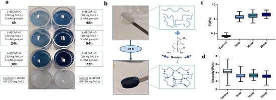 Effect of genipin crosslinking on L-dECM hydrogels. (a) Characteristic bluish staining of genipin (20 mg/mL + 5 mM genipin) time-dependent crosslinking compared to control (20 mg/mL); (b) Macroscopic images of the structural integrity of the control hydrogel (20 mg/mL) and hydrogel crosslinked with genipin (20 mg/mL + 5 mM genipin) and schematic illustration of the genipin cross-linking reaction; (c) Results of Young’s modulus (E) and (d) viscosity depending on the concentration of genipin administered to the hydrogels.
