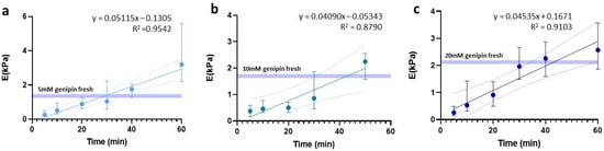 Linear regression of stiffness dependent on time prior to sample rehydration. Regressions are expressed for (a) 5 mM, (b) 10 mM, and (c) 20 mM.