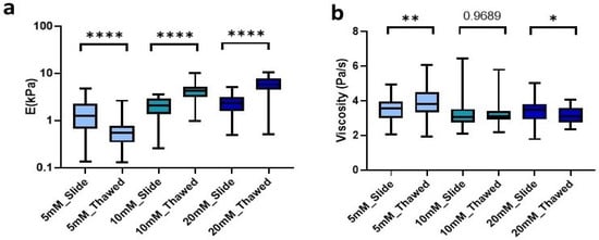 Finally, we were also able to observe similar changes in the viscosity of the matrices due to freezing. On the one hand, the 5 mM crosslinked matrices experienced a significant increase (p = 0.0058) in viscosity of 0.25 Pa/s in an inverse relationship to the effect of freezing on stiffness. On the other hand, matrices crosslinked with 20 mM genipin experienced a decrease (p = 0.037) in viscosity of 0.37 Pa/s. However, the 10 mM cross-linker was the only one that did not experience significant changes due to the effect of freezing and thawing of the sample (Figure 5b).