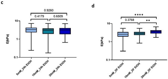 Analyzing in more detail the applied treatments, we could observe that the use of 70% EtOH for 24 h induced all matrices to display very similar stiffness values, despite the amount of genipin crosslinking concentration initially used (5 mM: 3.28 kPa (2.35–4.24 kPa), 10 mM: 3.11 kPa (1.93–3.85 kPa), 20 mM: 3.14 kPa (1.87–4.09 kPa)) (Figure 6c). In contrast, this effect was less noticeable when we applied much shorter sterilization periods (20 min), which still yielded a positive correlation of stiffness with genipin concentration, as observed for the non-EtOH treated hydrogels (Figure 6d).