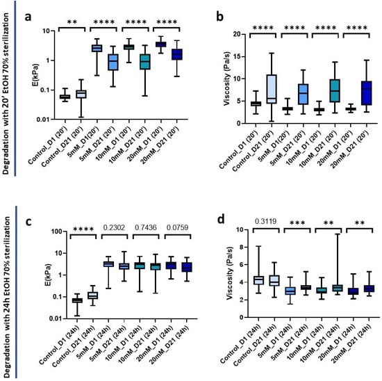 Non-crosslinked hydrogels experienced minor changes and interestingly were the only ones to experience a significant increase (p = 0.0068) in stiffness from 0.058 kPa (0.050–0.70 kPa) to 0.077 kPa (0.052–0.1 kPa) at 21 days post-20 min sterilization. Conversely, all crosslinked hydrogels underwent a significant decrease in stiffness (p < 0.0001) (Figure 7a). In parallel, in all cases there was also a highly significant (p < 0.0001) increase in viscosity. In addition, the interquartile range increased indicating a greater dispersion of the data after 21 days of sterilization application (Figure 7b).
