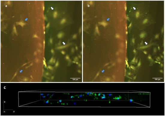 Cell behavior in cryosections of hydrogel crosslinked with 5 mM genipin. Epifluorescence images (a,b) show the same hydrogel location, but are focused on different planes. Cells have been stained with a Live/Dead kit. Image (a) is focused on the hydrogel top surface and shows only in focus cells that are adhered to the top of the hydrogel (blue arrows), while (b) is focused on the glass substrate and shows only in focus the cells that are adhered to the glass substrate (white arrows). All cells can be seen in both images (as indicated by arrows), while not simultaneously in focus. (c) Z-stack of cryosection with F-actin (green) and DAPI (nucleus).