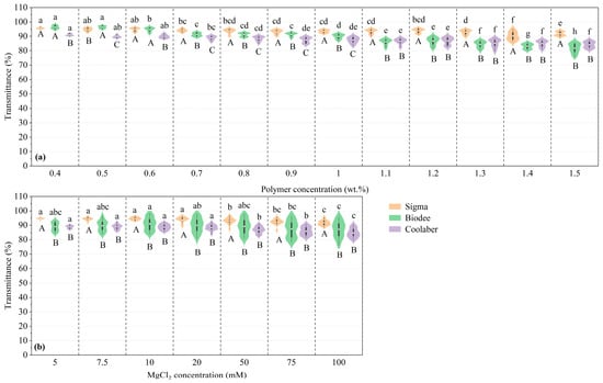 The transmittance of transparent soil, influenced by varying polymer (a) and crosslinker (b) concentrations for each Phytagel brand, visualized through violin plots and box plots. These plots were generated using Origin 2021 with default settings. The white lines represent the median in each plot, while the white dots denote the average value. When the same lowercase letters are used, it indicates no significant difference (p < 0.05) between the polymer concentrations or crosslinker concentrations within the same Phytagel brand. Similarly, the use of the same capital letters signifies no significant difference (p < 0.05) between Phytagel brands for each polymer concentration or crosslinker concentration level.