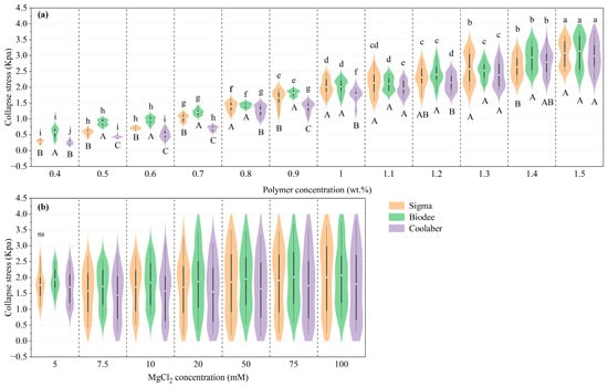 Figure 2 illustrates the impact of PCs and CCs on the collapse stress of TS for all PBs. The collapse stress of TS for each PB gradually increased with the increase in PC. These findings are in harmony with those of Ma et al. [] and Yan et al. [], while the influence of CC gradually increased (as reflected in the long axes of the violin plots in Figure 2a). Relative to that of Sigma, the collapse stress of Biodee was significantly increased or no significant difference under all PCs, while the collapse stress of Coolaber significantly reduced when the PC was lower than 1.0 wt.%, with no significant difference at other PC levels. The collapse stress values for Sigma, Biodee, and Coolaber increased within the respective ranges of 0.29 to 3.07 Kpa, 0.57 to 3.14 Kpa, and 0.25 to 2.98 Kpa as the PC concentrations escalated from 0.4 to 1.5 wt.%. Notably, Biodee exhibited the smallest increase, a 4.5-fold increment, which was considerably lower compared to the 9.6-fold increase observed for Sigma and the 10.7-fold increase recorded for Coolaber. This discrepancy can be attributed primarily to the fact that the collapse stress of Biodee was notably higher than that of the other two brands at 0.4 wt.% PC concentration.