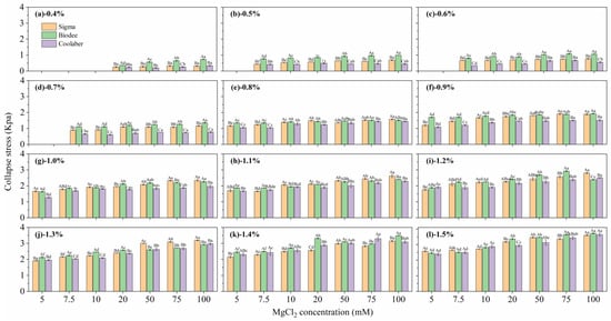 While the factor of CC did indeed have a significant impact on collapse stress, its effect was overshadowed by the much greater influence of PC on collapse stress, as depicted in Figure 2b. Consequently, the influence of CCs on the collapse stress of TS at each PC is displayed in Figure 3. It is evident that as CC increases, there is a significant increase in collapse stress. The collapse stress of Coolaber was significantly lower than that of Sigma and Biodee in most cases, and the collapse stress of Biodee was significantly higher than that of Sigma when the PC was lower than 0.7 wt.%.