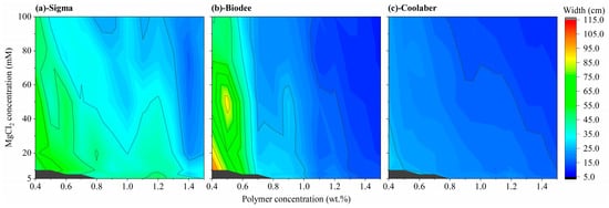 For Coolaber, no combinations allowed either the width and height of the growth box to be greater than 20 cm at the same time. When the allowed height of the growth box was reduced to 19 cm, two combinations met the standard, with the corresponding PC and CC being 1.2 wt.%—5 mM and 1.2 wt.%—7.5 mM, respectively. The width and height of the growth box were allowed to reach 20.4 × 19.4 cm and 21.3 × 19.1 cm, respectively. For the same reasons mentioned above, we chose 1.2 wt.% of polymer and 7.5 mM MgCl2 as optimized conditions for Biodee.