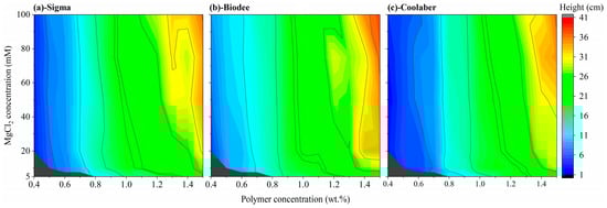 The maximum height of transparent soil prepared by Phytagel brands of Sigma (a), Biodee (b), Coolaber (c) as a function of the concentration of the polymer and MgCl2 solutions used during spherification.