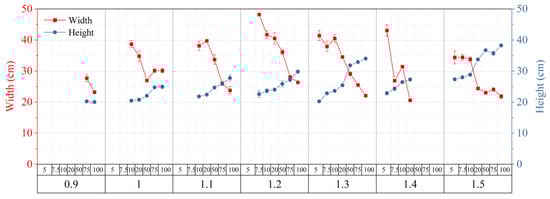 For Sigma, 36 combinations of PC and CC allowed both the width and height of the growth box to be greater than 20 cm (Figure 6). As shown in Figure 6, if the goal was to obtain the maximum allowed width, the optimized conditions were 1.2 wt.% of polymer and 7.5 mM MgCl2, with the corresponding width and height of the growth box being 48.2 × 21.6 cm. When the objective is to attain the maximum allowable height, the optimal conditions involve using 1.5 wt.% of the polymer and 100 mM MgCl2, resulting in a growth box dimension of 21.9 × 38.2 cm. However, if both width and height considerations are taken into account, the likely optimal conditions consist of 1.3 wt.% of the polymer and 50 mM MgCl2, yielding a growth box size of 29.1 × 31.9 cm.