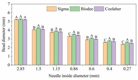 Bead size as a function of the inner diameter of the needle used during spherification. The values represent the means ± standard error (n = 15). Same capital letters denote that there is no significant difference (p < 0.05) between Phytagel brands for each inner diameter of the needle.