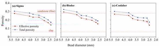 Total and effective porosity of transparent soil for Phytagel brands of Sigma (a), Biodee (b), Coolaber (c) as a function of the bead size.