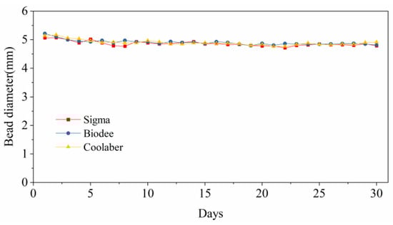 The size of the TS beads can change slightly over the course of several days due to the settling of the gel. Nonetheless, when the TS is saturated with fresh medium, the beads undergo a process of reswelling, returning them to a size close to their original state (Figure 9). Over a duration of 30 days, the particle size for Sigma ranged from 5.07 mm to 4.72 mm; for Biodee, it ranged from 5.21 mm to 4.79 mm; and for Coolaber, it ranged from 5.17 mm to 4.77 mm. The particle size of the three brands changed very slightly, which was consistent with the results of previous studies []. There was no significant instability in the TS bead size for the three Phytagel brands.