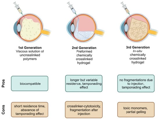 The hydrogel vitreous body replacement strategies have evolved from viscous solutions of uncrosslinked polymers as the first generation, through the second generation of preformed chemically crosslinked hydrogels, to the third generation of in situ chemically crosslinked hydrogels (Figure 1) [18].