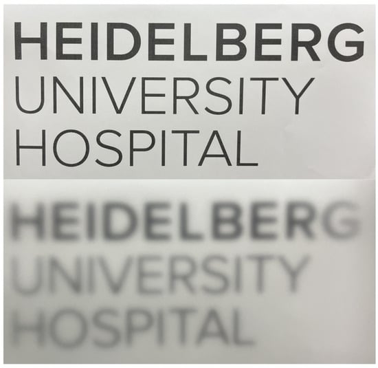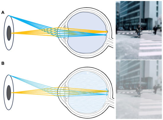 Third-generation vitreous bodies circumvent these concerns by chemically crosslinking the hydrogels in situ. In this case, many positive properties of hydrogels are combined, but the monomers must be extensively tested for toxicity since they gel in situ [19,42]. In the past, multiple reaction types, including click chemistry [19], aldehyde condensation [43], and Schiff base reactions [42], have been examined. Next to transparency, turbidity, and the refractive index, forward light scattering is an important parameter to measure in potential vitreous body substitutes to assess the predicted optical disturbance and glare that patients may experience [44,45]. A scattering of the light beam towards the retina, which can be caused by finely dispersed impurities, interfaces, or opacification of the gels, causes it to no longer focus on the retina [46]. Figure 2 showcases an illustration of the situation a patient might experience if the ocular stray light is increased. This important optical parameter has been previously studied in ophthalmology only in regard to intraocular lenses [44]. It was never evaluated for vitreous body replacement strategies.