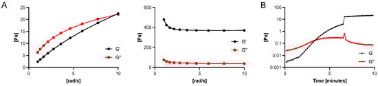 The gels were placed on the plate of the rheometer (Anton Paar MCR, 302e, Anton Paar, Graz, Austria). The second plate was then lowered to a distance of 1 mm. Viscosity measurements were conducted at 25 °C. Frequency sweeps were performed from 1 to 10 rad/s. Depending on the substance to be tested, roughened plates were used, as previously described, for the measurement of highly hydrated substances, such as the bovine vitreous body, to reduce wall slip [50].