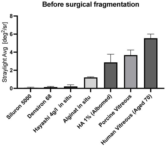 Forward light scattering has been used to assess the optical impact of implants in ophthalmology, especially for intraocular lenses made from different hydrophilic and hydrophobic acrylic materials [44,47]. However, the technology has not been applied to hydrogels and materials of posterior segment surgery. The highest stray light values in our studies were seen for a 2nd generation vitreous body replacement after fragmentation with a mean of 11.4 deg2/sr, roughly three times the amount of stray light induced by a juvenile, porcine vitreous body (see Figure 6 and Figure 7). To set these results into perspective, this amount of stray light is induced by the average crystalline lens of a 70-year-old patient (mean: 11.2 deg2/sr), as previously reported [48]. Increased forward light scattering can lead to symptoms such as glare and reduced contrast sensitivity, compromising daily activities. Given that patients receiving vitreous body replacements most likely have significant retinal comorbidities, additional sources of stray light should be minimized.