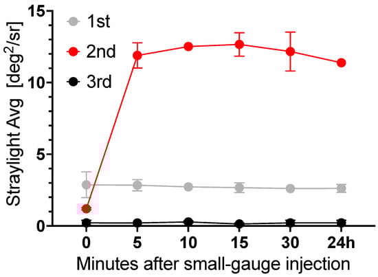After injection through a 23G-polyimide cannula, stray light of the vitreous body replacement strategies was evaluated. For the 3rd generation of hydrogel, both components were mixed and injected through the cannula, as applied in porcine in vivo studies to overcome gel fragmentation. Thus, gelation again occurred in the UV-cuvette [19]. Fragmentation introduced visible interfaces in second-generation hydrogels immediately after injection. Stray light did not recover over a 24-hour period. The 1st and 3rd generation hydrogels showed no changes in stray light before and after injection (Figure 5).