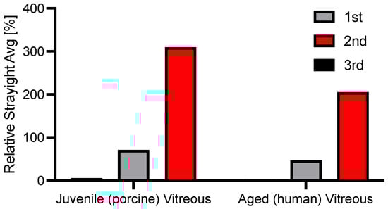 In this study, we also conducted the first reported in vitro measurements of the natural porcine and, thus, juvenile and 70-year-old human vitreous bodies. The vitreous body is composed of different collagens, hyaluronic acid, and other glycosaminoglycans. During the aging process, the association between collagen and hyaluronan is altered, causing liquefication and fibrous degeneration [2]. Previously, only one in vivo study in human subjects conducted forward light scattering measurements focusing on the vitreous body, specifically on myodesopsia [49]. Castilla-Marti et al. showed that in patients with monocular floaters, collagen aggregates in the aged vitreous body and a sign of vitreous aging, higher stray light values can be observed compared to the healthy partner eye. In line, the human-aged vitreous showed higher stray light than the juvenile porcine vitreous body of pigs aged 8–9 months. Previously, only the viscoelastic but not the optical properties of the vitreous body were evaluated in detail in vitro. Filas et al. showed that vitreous body aging could be simulated by enzymatic degradation using G′ and G″ as well as their ratio as the outcome [50]. Similarly, Schulz et al. examined human vitreous bodies of different ages and were able to show a clear decline in viscoelastic properties of the vitreous body with increasing age [51]. Further studies should evaluate the optical change of enzymatic degradation of the vitreous body.