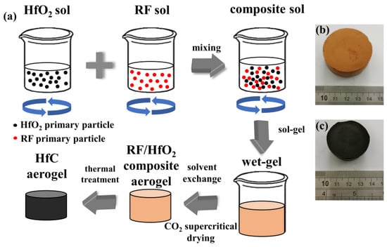 (a) Process flow chart of HfC aerogel preparation, the macro sample diagram of (b) RF/HfO2 composite aerogel, and (c) HfC aerogel.