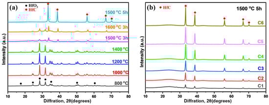 (a) XRD patterns of the HfC aerogel heat-treated at various temperatures and for various time durations (800 °C, 1000 °C, 1200 °C, 1400 °C, 1500 °C, and 1600 °C for 3 h; 1500 °C for 5 h), (b) XRD patterns of the HfC aerogel with various Hf/R molar ratios heat-treated at 1500 °C for 5 h.