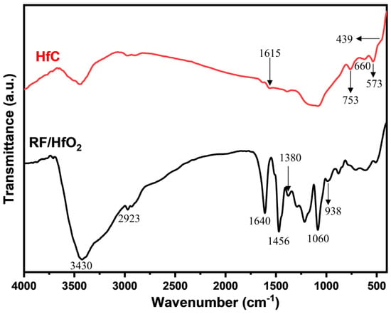 In Figure 4, the FT−IR spectra of RF/HfO2 and HfC aerogels fabricated under reaction conditions are displayed. The broad absorption band at 3430 cm−1 is attributed to the –OH bonds within water molecules adsorbed within the sample [,]. At 2923 cm−1, the spectrum reveals the stretching vibration absorption of the C−H bond found in –CH2. The C–O bond is associated with the bands at 1240 cm−1 and 1060 cm−1. Notably, the formation of the benzene skeleton within the RF system gives rise to the distinctive band observed at 1456 cm−1 []. Further spectral features emerge in the region of 1640 cm−1 and 1615 cm−1, corresponding to the stretching vibration of the C = C bond. The presence of Hf–O bonds is evidenced by bands at 439 cm−1, 660 cm−1, and 753 cm−1 [].
