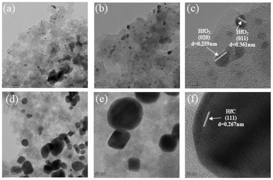 Figure 6a–c provide compelling visual evidence of the presence of HfO2 particles within the aerogels. Notably, the distinct lattice fringes with interplanar distances measuring 0.259 nm and 0.361 nm correspond to the (020) and (011) planes of HfO2, as they appear in Figure 6c. These HfO2 structures are intimately surrounded by carbon nanoparticles, offering insight into the composite’s microstructure. Figure 6d shows the emergence of HfC particles within the composite aerogels following heat treatment at 1500 °C for 3 h. The HfC particles exhibit diameters in the approximate range of 50–100 nm, corroborating findings from SEM observations depicted in Figure 6d. Within this micrograph, a distinct lattice fringe with an interplanar distance of 0.267 nm is observable, attributing this feature to the (111) plane of HfC. This finding further validates the premise that carbothermal reduction leads to the transformation of HfO2 into HfC particles. It is noteworthy that in Figure 6d,e, a trace amount of HfO2 is still discernible, which is in alignment with the XRD analysis.