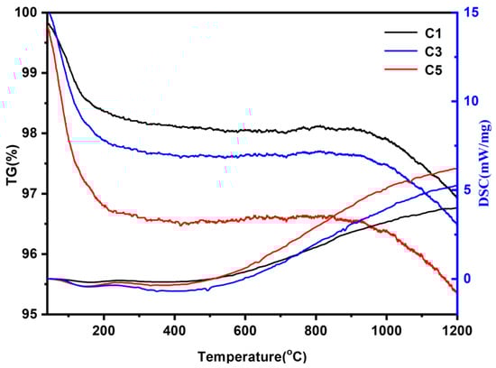 The TG and DSC curves of HfC aerogels with various Hf/R molar ratios obtained under an argon atmosphere are shown in Figure 7. TGA-DSC analysis serves as a valuable tool for assessing the sample′s thermal stability. The thermogram profile can be delineated into three distinct sections, as depicted in Figure 7: (1) 30–200 °C, (2) 200–900 °C, and (3) 900–1200 °C. In the initial stage (30–200 °C), a minor weight loss of approximately 1.2–3% is observed. This initial weight loss primarily results from the evaporation of ethanol and the removal of physically adsorbed water. The subsequent stage, spanning the temperature range of 200–900 °C, exhibits a gradual mass loss of approximately 0.5%. The third weight loss stage, occurring within the temperature range of 900–1200 °C, exhibits a mass loss of approximately 1.3%. This phenomenon can be attributed to the reaction between the remaining unreacted oxides within the HfC aerogel and carbon aerogel particles, leading to a continued reaction at elevated temperatures and the generation of HfC. This process results in a further mass loss within the aerogel. Notably, as the molar ratio of Hf/R increases, there is an escalation in mass loss at high temperatures, as evident from the figure. This observation underscores the remarkable temperature resistance exhibited by HfC aerogel within an inert atmosphere.
