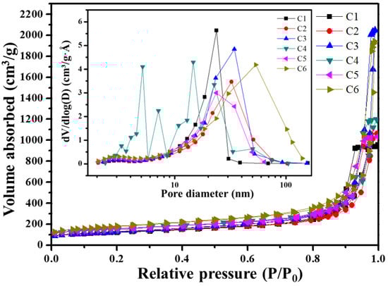 Figure 8 presents nitrogen sorption isotherms classified of the HfC aerogels according to the IUPAC standards. The curves depicted in Figure 8 are characteristic of type-IV isotherms with H1-type hysteresis loops, a hallmark of mesoporous materials featuring cylindrical pores. The adsorption ratio (P/P0) of less than 0.05 is indicative of micropores dominating the structure. In the vicinity of relative pressures around 0.5, both mesopores and macropores exhibit multi-layer adsorption processes on their external surfaces. The absence of an adsorption plateau as P/P0 approaches suggests that only a limited number of macropores are present. Table 3 provides the average pore sizes, typically falling within the range of 10–23 nm for this mesoporous material. Furthermore, it is noteworthy that the specific surface areas exhibit an increasing trend as the Hf/R molar ratio increases. For instance, sample C6, with an Hf/R ratio of 2:1, boasts an average pore diameter of 23.34 nm and a maximum surface area of 601.02 m2/g. This is notably higher than those reported in previous studies on carbide aerogels [,,,].