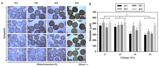 Effect of applied voltage on the morphology of mineralized microgels as a function of the concentration of mineral precursor. (A) Optical images (scale bar 200 μm) and (B) evaluation of the average diameter via image analysis. Results were presented as mean ± standard deviation (** p < 0.01).