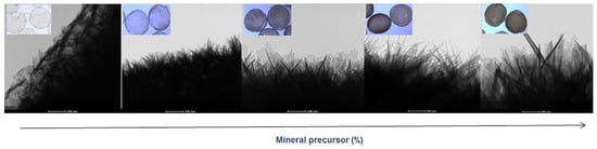 The mineralization of microgels was observed, in detail, by bright-field transmission electron microscopy (TEM) images (Figure 3) of a portion of the microgel surface gels. By comparison with pure SA microgels—which show a smooth surface—it is possible to recognize a diffused presence of mineral crystals with needle-like structures that gradually increase in size as a function of the concentration of mineral precursor used.