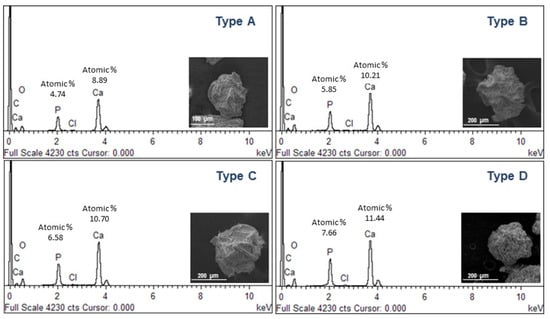 In order to confirm the composition of precipitated crystals, further investigations were performed by scanning electron microscopy (SEM) and X-ray energy dispersive spectroscopy (EDS) (Figure 4). Single particles reported by SEM images qualitatively show a different surface smoothness, ascribable to the different amount of mineral phases formed during the atomization process. Accordingly, the aspect changes, moving from a spherical to a quasi-spherical shape. This can be directly related to the mutual effect of crosslinking and mineralization processes and by the competition of phosphate with Ca2+, especially when the system is saturated [,]. This leads to the precipitation of mineral phases with a (Ca/P) molar ratio close to the characteristic ratio of stoichiometric hydroxyapatite (Ca/P = 1.67), as confirmed by EDS spectra.