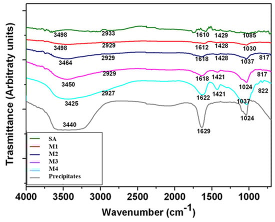 ATR-FTIR spectra of mineralized microgels processed by different mineral precursor concentrations. SA microgels were reported as negative control (SA), while calcium phosphate precipitates obtained by in situ reaction in solution (no atomization) were reported as positive control (precipitates).