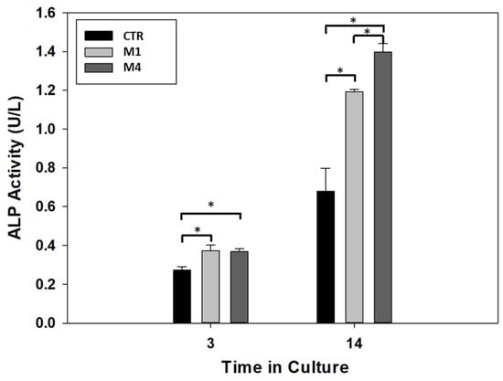 ALP activity of DPSCs in the absence of microgels (CTR) (with lower CaP (Type M1) and higher CaP (Type M2) content). (* p < 0.05).