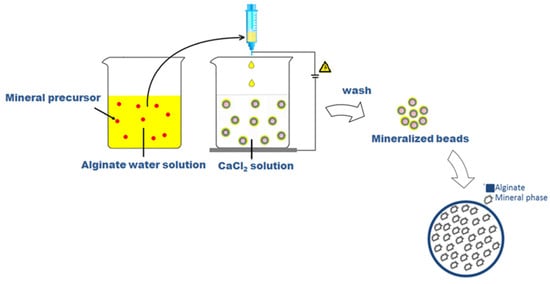 Sodium alginate (SA) from brown algae (viscosity 20,000–40,000 cPs, Sigma Aldrich, Milan, Italy) was used to prepare a 2% wt/v aqueous solution as a basic formulation to form the µ-gels. Different process parameters, including voltage—i.e., 21, 25, 28, and 30 kV—and flow rate—0.1, 1, and 5 mL/h—were considered during the process, with high reproducibility assured by the use of a commercial machine for pre-industrial use (NF500 MECC, Fukuoka, Japan). In this case, it was equipped with a customized magnetic stirrer acting as a particle collector, in agreement with the patented process []. In this work, the native process setup was further adapted to permit the entrapment of mineral phases during the particle formation, as described in Figure 8.