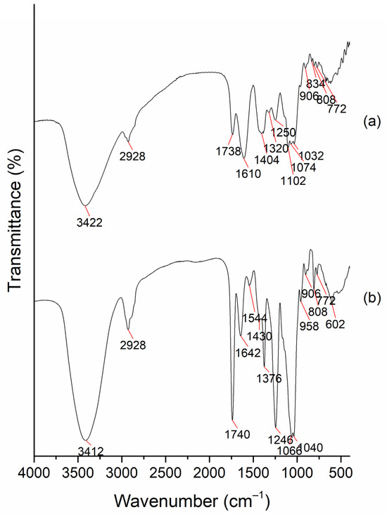 The chemical composition was analyzed using the FT-IR transmission spectrum shown in Figure 1. The strong band at 3422 cm−1 corresponds to a vibration of the -OH group, and the peak at 2928 cm−1 corresponds to the stretching vibrations of the C-H aliphatic bonds. Both bands are characteristic of mono- and polysaccharides in general. The weak signal at 1738 cm−1 corresponds to C=O groups, and the bands at 1610 and 1404 cm−1 are due to asymmetric and symmetric stretching of C-O bonds (from the ester groups, COO−). Additionally, it can be seen that the peak at 1032 cm−1 evidences the presence of glycosidic bonds, and the one at 808 cm−1 is associated with a mannose unit, which is a representative component of acemannan (a main bioactive polysaccharide in aloe gel, as reported in the literature) [20,21]. Similar spectra were found in previous work reported by Pereira et al. [22,23]. The FT-IR spectrum of the major bioactive polysaccharide extracted from pasteurized AVG presented in Figure 1b is similar to that reported by Chokboribal et al. [24] for acemannan polysaccharide. This spectrum is different from the one obtained from the freeze-dried fresh gel shown in Figure 1a. In the spectral region between 900 and 1200 cm−1, the intense absorption bands due to the C–O–C bonds’ stretching vibrations can be seen. They are called the saccharide bands; they are sensitive to the conformational changes in the molecules and are directly related to the crystal and amorphous phase in the samples [25]. Peaks at 808 cm−1 and 1040 cm−1 are due to the glycosidic bonds and mannose units, respectively. Other strong and sharp absorption bands are observed at 1740 cm−1 and 1246 cm−1, which correspond to the C=O group and the C-O-C stretching, respectively, and are related to the acetyl groups in acemannan [26].