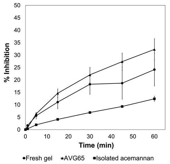 In addition to polysaccharides, AVG is composed of a variety of other substances, such as polyphenolic compounds. Sumi et al. [16] identified phenolic acid molecules using high-performance liquid chromatography, including catechin hydrate, caffeic acid, ferulic acid, ellagic acid, and quercetin, among others, which are responsible for the gel’s antioxidant activity [16]. Flavonoids are susceptible to oxidation, depending on the pH, water activity, radiation, oxygen, metals, antioxidants, temperature, enzyme activity, storage conditions, and time [17,30]. Figure 3 displays the antioxidant activity of three different samples of lyophilized AVG. The sample with the highest percent of inhibition was the gel previously pasteurized at 65 °C for 15 min (AVG65). After 1 h, the inhibition rate reached 30%. This result is similar to what was reported by Rodriguez et al. [31], who measured the antioxidant activity of aloe vera gel after pasteurization, which might correlate to some improvement in the medicinal properties of the plant. Acemannan isolated from the gel evidenced lower antioxidant activity (only 10% of inhibition after 1 h) when compared to the fresh and pasteurized gels. This result might be due to the purification process during dialysis with a 12–14 kDa cut-off membrane, possibly removing small molecules like phenolic acids and flavonoids, which are mainly responsible for the antioxidant activity.