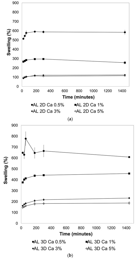 AL dressings can help in wound healing by maintaining constant moisture, absorbing excess exudates from the wound, and reducing local pain through a wound cooling effect [41]. AL provides a moist environment for the wound, stimulating epidermis regeneration. At the same time, AL films have good permeability to water vapor, carbon dioxide, and oxygen, thus protecting the wound from bacterial infections. However, they possess lower swelling capacity than AL hydrogels (which absorb 20 times their weight). Therefore, films are considered less effective for wounds with excessive exudates [9]. In the swelling experiments, the hydration of the polar functional groups in AL and AV chains is responsible for the weight gain of the films. [42]. The swelling behavior of the AL-AVG 2D and 3D films was monitored for 24 h. All tested samples were prepared by crosslinking with a 1% CaCl2 solution. The results shown in Figure 6a,b indicate that the amount of AVG incorporated into the AL films is decisive in the swelling capacity, with a higher amount of AVG in the AL films resulting in a greater rate of swelling. The AL-AVG25 2D film (highest AVG ratio) could only be measured for 4 h of swelling since it broke into small pieces that could not be recovered after incubation in the pH 5.5 buffer solution. All the 3D AL films, with exception of the sample prepared with 10% AVG (lowest ratio), showed rapid degradation, possibly due to an increased surface area and an increased capacity of water absorption in these films.