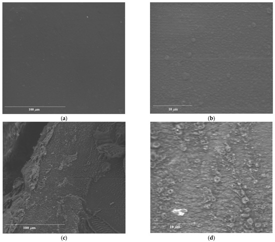 SEM images of films: (a) AL-AVG10 2D at 1300× magnification; (b) AL-AVG10 2D at 8500× magnification; (c) AL-AVG10 3D at 1300× magnification; and (d) AL-AVG10 3D at 8500× magnification.