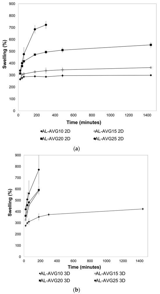 When higher concentrations of AVG were incorporated into the films, higher swelling values were obtained, ranging between 250% and 750% of the original weight of the films. The components of AVG have a high hydrophilic character that contributes to the retention of the aqueous buffer solution. It is important to emphasize that in the cases of AL-AVG25 2D, AL-AVG15 3D, AL-AVG20 3D, and AL-AVG25 3D, the test could not be completed because the swollen films could not be weighed since the membranes broke into pieces. The results in Figure 6a,b show the swelling rate of the AL-AVG films, which depend on the concentration of AVG.