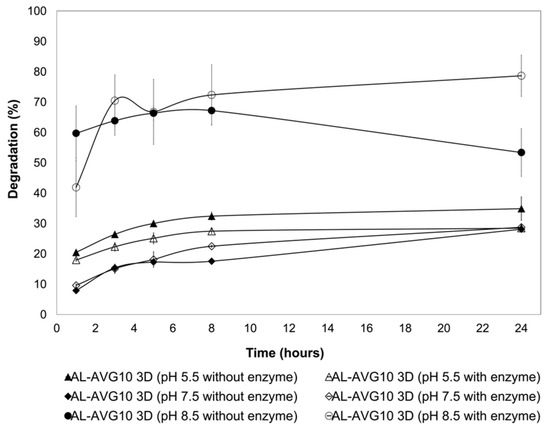 Under basic conditions (pH 8.5), the mass loss of the AL-AVG10 3D membrane was higher and faster than under pH 5.5 and 7.5 conditions. At this basic pH, the higher solubility of alginate (an anionic polyelectrolyte) is probably responsible for the degradation of the films. The effect of the enzyme on the degradation of the films was not remarkable at pH 5.5 and 7.5; however, a significant increase in the degradation of films was observed at pH 8.5 after 5 h incubation. Enzyme activity is affected by reaction conditions, especially pH and temperature. Lysozyme presents maximum activity at pH 5 and it decreases under acidic conditions (lower than pH 3.8) and alkaline conditions [46]. Considering the lysozyme activity, the degradation behavior of AL films was more influenced by the pH than by enzymatic hydrolysis. The results evidence that the AL-AVG10 3D films are suitable for chronic wound dressings since they degrade rapidly and are able to release any incorporated active components to the wound site as quickly as possible. The lowest film degradation was observed under neutral conditions (pH 7.5, acute wound simulated conditions), i.e., less than 25% degradation even after 24 h.