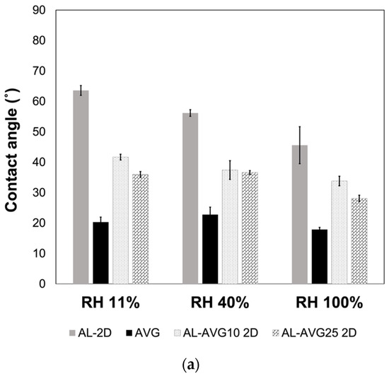 Contact angles of a drop of water on AL, AVG, AL-AVG10, and AL-AVG25 (a) 2D and (b) 3D films at different relative humidity (RH).
