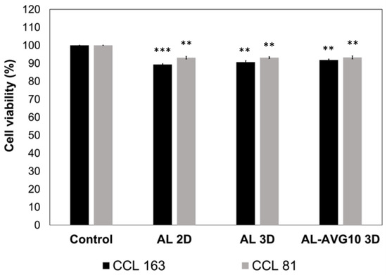 Cytotoxicity of 2D AL, 3D AL, and 3D AL-AVG films determined by cell viability of CCL 163 and CCL 81 cells over 48 h. Viability was obtained by comparison with the negative control (no treatment). Data are presented as mean ± SD (n = 3). Statistically significant differences were achieved by comparing control and AL membranes. *** p < 0.001; ** p < 0.01. The degree of freedom is 2.